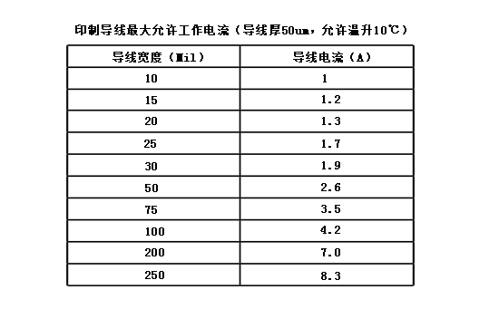 銅線的寬度應(yīng)根據(jù)其能承載的電流進行設(shè)計。銅線的載流量取決于以下因素:線寬、導線厚度(銅鉑厚度)、允許溫升等。下表給出了銅線寬度、導線面積和導電電流(軍用標準)之間的關(guān)系。根據(jù)這一基本關(guān)系,可以適當考慮導線寬度。